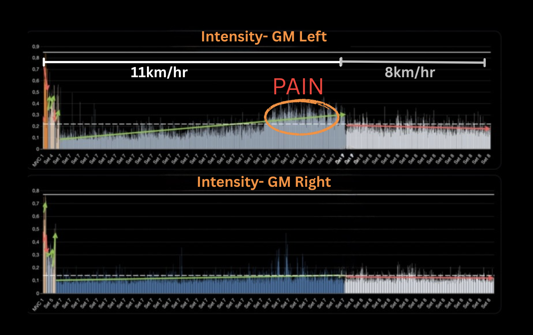Left GM had a significant ramp up in fatigue at 11km/hr, highlighted by a large ramp in step-by-step, cleaned and normalized intensity compared to the right.